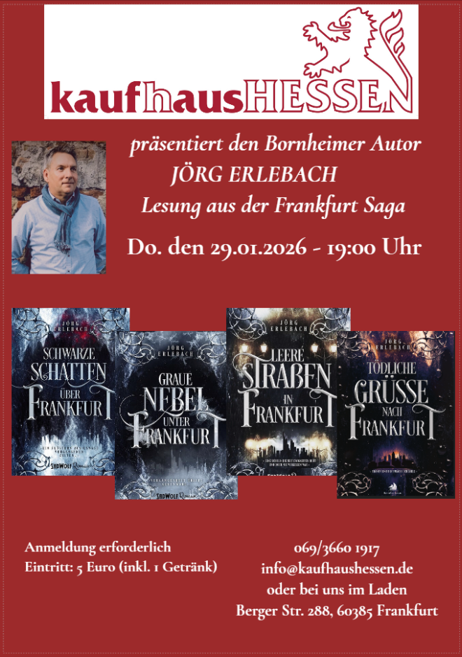 Am 29.01 liest der Frankfurter Autor Jörg Erlebach bei uns im Kaufhaus Hessen auf der Berger Straße 288 aus dem ersten Buch seiner Frankfurt Saga. Den Autor hat es vor über 20 Jahren nach Frankfurt verschlagen. Hier lebt, arbeitet und schreibt er im schönen Stadtteil Bornheim. Die Mainmetropole steckt voller alter Sagen und so ist die Frankfurt Saga entstanden - ein Mix aus Krimi, recherchierter Historie und fantastischen Welten. Die Saga umfasst 4 Bücher.